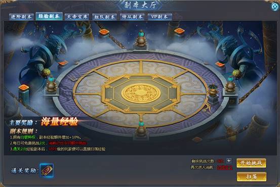 VIP1的玩家可以直接扫荡副本,通过充值赠送的讨伐令可额外进入经验副本。