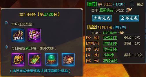 以上两个任务如果嫌麻烦可以直接选择一键全部完成,省时省力,我们还为您省钱,完成一环只要2元宝,省去每天刷怪时间,可以空出更多时间来抢BOSS。