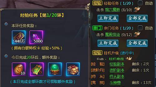 每天20环的经验任务,随着等级提升可获得海量经验,一定要做;