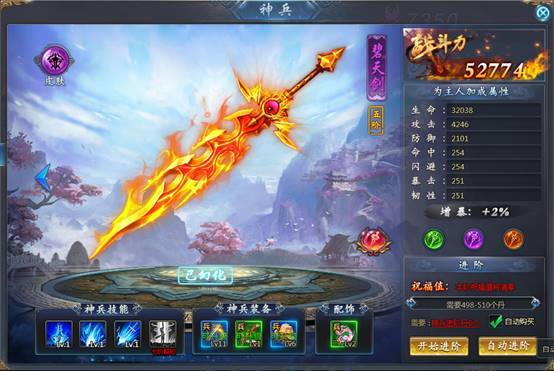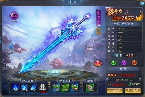神兵是人物武器的外显系统,会为主角增加属性,神兵系统上还可以佩戴3件神兵装备以及一件配饰,三件神兵装备各为主角增加攻、防、血单项属性,配饰增加攻防血三项属性,随着神兵的进阶,玩家还可以使用神兵技能书提升血量、防御、命中、韧性四项属性,三阶开始能给神兵系统使用神兵成长丹,分为神兵成长丹、神兵潜能丹、神兵突破丹三种,可以为神兵系统额外增加大量的属性。