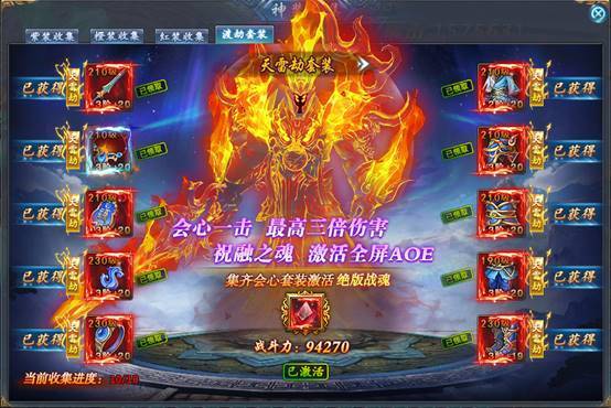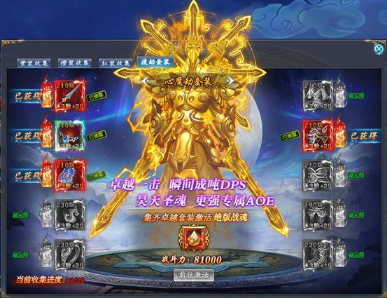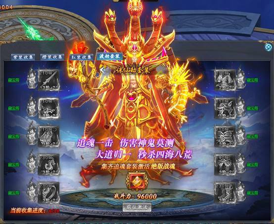 而且每集齐一套渡劫装备,可在“套装收集”功能中激活一个上古战魂