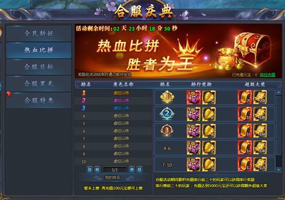 合服活动期间累计充值排行活动,高级宝石、寻宝图、极品兑换券、天书残卷等你来拿!